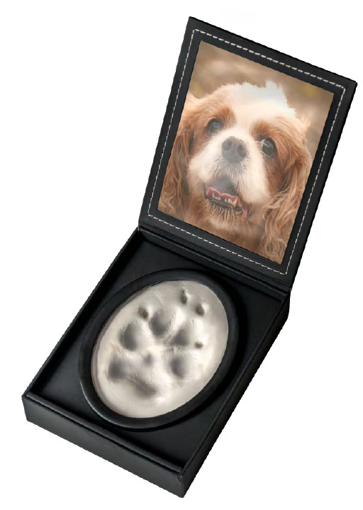Este kit é perfeito para dar "uma impressão duradoura". O atraente disco oval contém uma argila de polímero e se encaixa perfeitamente dentro de sua caixa de fotos de apresentação (couro preto), uma vez que a impressão foi feita.
